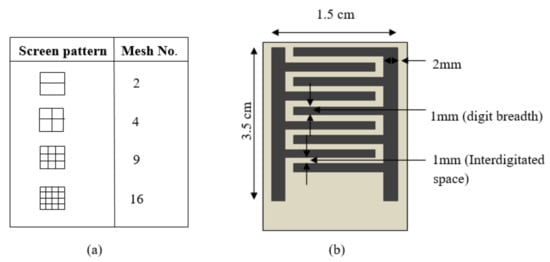 A screen of mesh number 250 was used for the screen printing of interdigitated electrodes and films of prepared composites. The mesh number refers to the number of openings present per linear inch of a screen, as shown in Figure 9a which presents an example for knowing the mesh size of a screen corresponding to a given mesh number. The screen plate was made of a stretchy fine lattice designed with the desired shape of pattern. A silver conductive silver paste was utilized for the printing of an interdigitated electrode pattern on flexible polyethylene terphthalate (PET) substrate. The interdigitated space was kept at 1 mm. The structure was 1.5 cm wide and 3.5 cm long with 1 mm of digit breadth as shown in the illustration in Figure 9b. The illustration of the interdigitated electrode clearly shows the desired dimensions and pattern.