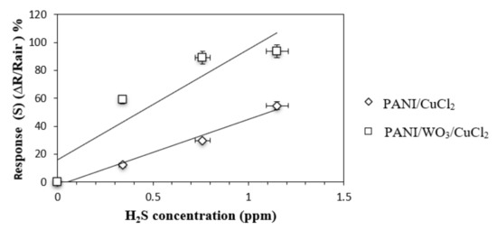 In addition, the direct reactivity of nanostructured WO3 (tungsten oxide) with H2S gas may also be involved along with the heterojunction which may be attributed to the high sensitivity of WO3 towards H2S [13]. The sulfidation of WO3 during H2S gas exposure (Equation (20)) can increase the conductivity measurement of the PANI/ WO3/CuCl2 composite film, as tungsten sulfide is more conductive in nature than its oxide form.