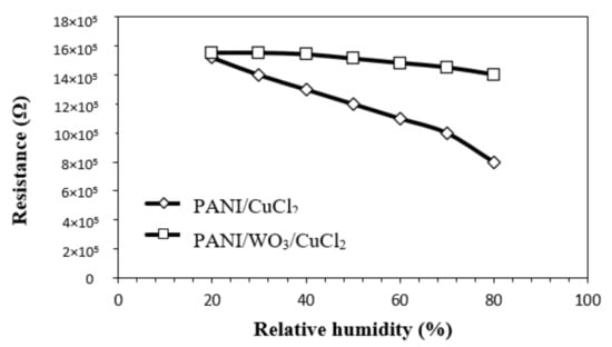 Change in resistance of PANI/CuCl2 and PANI/WO3/CuCl2-based sensors with changing ambient relative humidity %.