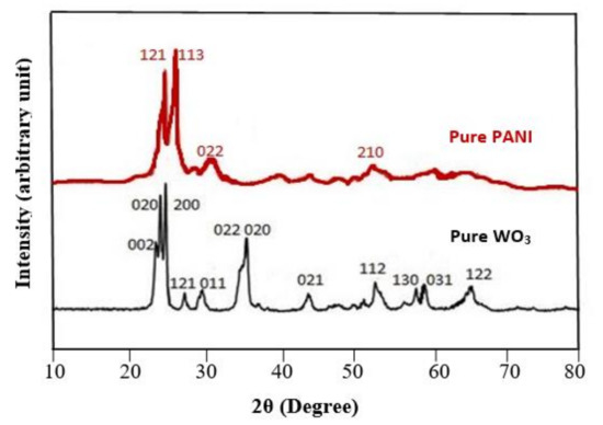 The crystallinity and phase of the PANI/WO3/CuCl2 nano-composite were checked using XRD with a 2θ scan from 10° to 80°. Cu K -Alpha radiation (λ = 1.54060 Å) was used as the X-ray source. Figure 26 shows the XRD pattern of PANI film synthesized by the chemical oxidative method and WO3 nano-film obtained by the hydrothermal method.