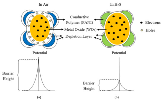 Secondly, the amplification mechanism is dedicated to taking advantage of the variation in the p-n junction region in the heterostructures which can be very sensitive to gas adsorption. The heterojunction here refers to the physical interface between two dissimilar semiconducting materials, i.e., conductive polymer and metal oxide, by creating intimate electrical contact at their interface. It is well known that WO3 is an n-type inorganic semiconductor, which has electrons as a major charge carrier and PANI is a p-type organic semiconductor which has holes as a major charge carrier. When PANI and WO3 come into contact due to the difference in their work function, the Fermi level across the interface equilibrates to the same energy which results in charge transfer and the formation of a depletion layer [32]. The heterojunction-induced depletion layer coexists with the depletion layer induced by the adsorbed oxygen on the surface. Therefore, two simultaneous depletion layers result in a wider depletion layer than the pure metal oxide films. As a result, the potential barrier and resistance of the film at this point is very large, hindering the flow of charge carriers [6] as shown in Figure 29a.