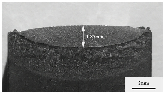 Figure 2 shows the macroscopic morphology of the TCN coating. It can be seen that the thickness of the coating is about 1.85 mm, there are no obvious cracks, pores, or other defects on the surface, and the cross-section is lenticular. After cladding materials melted with the matrix, an arc-shaped fusion line was formed at the bonding area, which showed good metallurgical bonding.