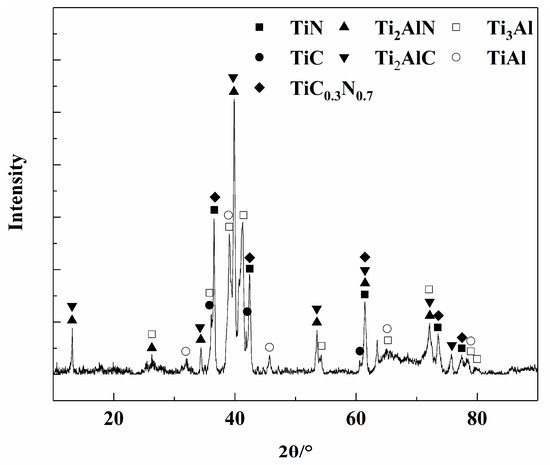 Figure 3 shows the interface of the TCN coating and the microstructure in the middle of the coating. It can be seen that the transition between the fusion coating layer and the substrate is smooth, and there are no defects such as pores or cracks. The reinforced particles in the melted coating layer were densely and evenly distributed. The dendrites and a small amount of particle crystals were mainly distributed on the substrate at the bottom of the coating, while the dendrites in the middle of the melted coating layer gradually increased and tended to be developed. The characteristics of rapid melting and solidification of laser cladding made the ceramic phase precipitating in the Ti-Al-C-N melt, and grow mainly in the form of dendritic crystals. During the solidification process, the movement of the solid–liquid interface gradually reduced the temperature gradient, and the dendritic crystals in the middle of the coating gradually tended to be developed. Figure 4 shows the XRD pattern of the coating. It shows that TCN is composed of intermetallic compounds TiAl and Ti3Al, ceramic phase TiC and TiN, ceramic solid solution phase TiC0.3N0.7, and MAX phase Ti2AlC and Ti2AlN.