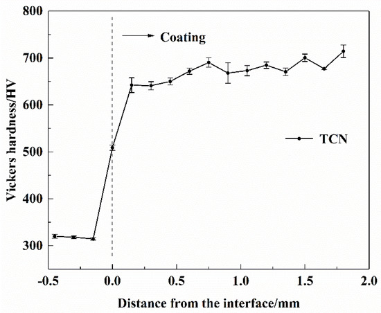Figure 5 shows the microhardness distribution of the cross-section of the TCN coating, and the average hardness is 673.56 HV, which is 2.04 times that of the substrate TC4 alloy (330 HV). It can be seen from Figure 5 that from the bottom to the surface, the hardness of TCN continuously increased, and the hardness of the bonding zone greatly increased, which is because during the solidification process, the extremely fast cooling rate made the coating layer fine and produced martensite with high hardness inside the matrix. In addition, hard particles such as dispersed ceramic solid solution phase TiCxN1−x and MAX phase Ti2AlC and Ti2AlN were in situ generated on the substrate of the coating. During the solidification process, with the mutual restriction of the growth of TiC and TiN, the microstructure of strengthening phases in the coating presented a fine and dense state. At this time, the internal hardness of the coating was high and evenly distributed.