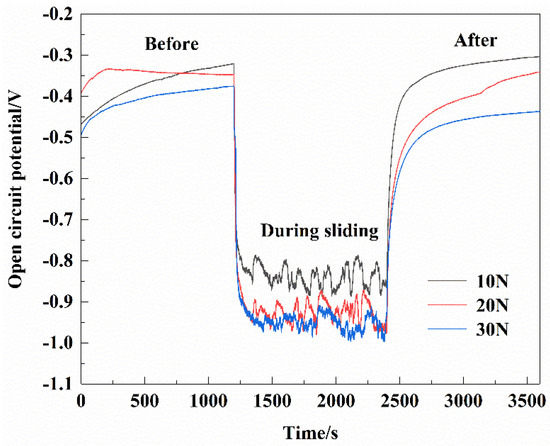 The open-circuit potential curves of TCN composite coatings before, during, and after friction under different load conditions are gathered in Figure 6. It shows that before friction, as the soaking time rose, the open-circuit potential slowly increased, indicating a dense and stable passive film gradually formed on the surface of the TCN coating. As wear started, the open-circuit potential represented the mixed potential between the worn area and the unworn area, and reflected the corrosion trend of the whole surface. Under various load conditions, the open-circuit potential of TCN dropped sharply by about 0.5 V because the ploughing action of the grinding ball on the sample surface led to removal of the passive film and some surface materials, thereby exposing the fresh surface to corrosive medium. The galvanic cell was formed in both worn and unworn areas due to potential differences, and the fresh surface can be used as the anode of the cell due to the low potential, which made corrosion reactions accelerate [19]. As the applied load rose, the exposed fresh surface of the damaged area increased, resulting in an enhanced corrosion area and deteriorated corrosion in the wear area. As a result, the open-circuit potential drop of the sample also increased [17]. By stopping wear, the open-circuit potentials of samples started to slowly rise, indicating that a passive film was regenerated on the surface of the samples which had good re-passivation ability.