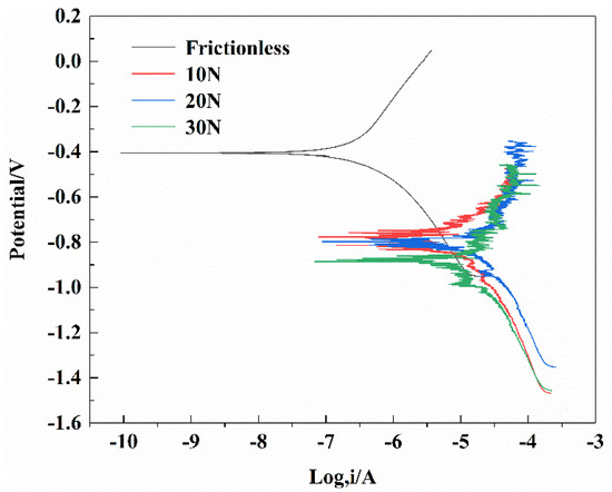 The polarization curves of TCN during static and dynamic corrosion friction processes are depicted in Figure 7. The parameters related to static corrosion and friction corrosion are listed in Table 2. Without friction, the self-corrosion potential of TCN was −0.405 V, and the corrosion current density was 0.2 μA·cm2. During friction and wear, the polarization curves showed obvious oscillations due to the dynamic process of removal and formation of the passive film on the sample surface. As the load rose, the friction became more intense, resulting in the enhancement of plastic flow of the material surface. Additionally, the density of defects, such as dislocations and vacancies in the local deformation area, increased. The wear area with more defects and gathered residual stress became the anode of electrochemical battery due to its high corrosion activity, which aggravated its corrosion reaction. As a result, the self-corrosion potential of TCN decreased by about 0.3 V, while the corrosion current increased by two orders of magnitude. Under 30 N, the self-corrosion potential decreased to −0.89 V, and the corrosion current density increased to 24.5 μA·cm2.