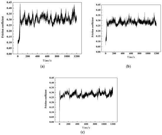 Friction curves of the TCN coating under different load conditions in artificial seawater: (a) 10 N, (b) 20 N, and (c) 30 N.