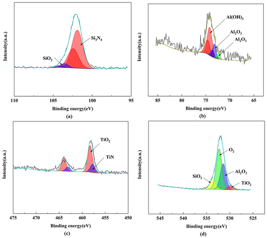 The existence of elements in the wear scar of the composite coating TCN surface was further analyzed by XPS testing. Figure 9 presents the 3D XPS spectra of Si 2p, Al 2p, Ti 2p, and O 1s. As shown in Figure 9a, Si 2p displayed two pairs of obvious peaks, with one pair near 101.9 and 102.4 eV corresponding to Si3N4 phase. It shows that, due to the fatigue effect caused by the reciprocating motion between the grinding pairs, adhesive wear occurred there, and the surface material of dual-sphere Si3N4 fell off and adhered to the composite coating surface during friction. The other pair was located near 103.6 and 104.2 eV, corresponding to SiO2 phase, indicating that the Si3N4 debris in the wear scar was retained in the TCN wear scar and oxidized to SiO2 under the promotion of friction. According to Figure 9b, three pairs of peaks can still be fitted despite the Al 2p map showing obvious noise due to pollution. Among peaks, those at 72.30 and 72.76 eV, as well as 73.24 and 73.65 eV, corresponded to Al2O3, indicating the oxidation of Al on the coating surface. The peaks at 74.20 and 74.63 eV were attributed to Al(OH)3, suggesting the generation of Al(OH)3 with a boundary lubricating effect by tribochemical reaction of Al2O3 during friction. In Figure 9c, TiO2 was recorded at 458.3 and 464.0 eV, and TiN was observed at 457.70 and 463.00 eV in the Ti 2p map. These data revealed the oxidation of Ti on the coating surface. As shown in Figure 9d, the spectra of O 1 s corresponding to TiO2, Al2O3, O2, and SiO2 were observed at 529.9, 531.4, 532.3, and 533.7 eV, respectively. In summary, the passive film on the composite coating surface was composed of TiO2 and Al2O3. Additionally, some lubricating hydroxides were generated due to frictional chemical reactions during friction.