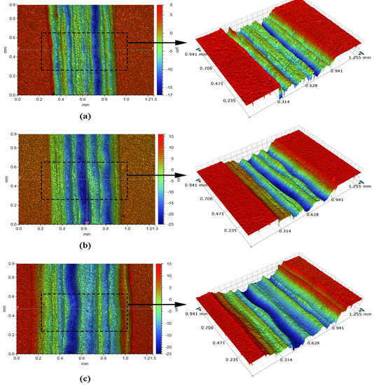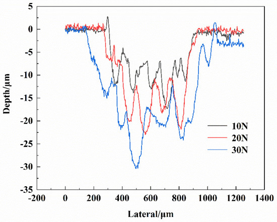 The three-dimensional morphologies of the wear scar of the TCN coating in artificial seawater under different loading conditions are provided in Figure 10. Figure 11 shows a cross-sectional view of the center position of the wear trace morphology of the sample in the three-dimensional morphologies in Figure 10. Obvious furrows were seen on the surface of wear marks, mainly presenting typical abrasive wear morphologies. As load increased from 10 to 30 N, the width and depth of the wear scars enhanced, and average widths were estimated to be 601.6, 656.7, and 909.1 μm, respectively. The maximum wear scar depths were 17.92, 25.90, and 29.51 μm, respectively. In addition, the increase in load led to increments in surface roughness of the wear scars from 4.649 to 8.418 μm. Meanwhile, the number of furrows in wear scars gradually increased, indicating enhanced material loss between the friction pairs during friction that aggravated abrasive wear.