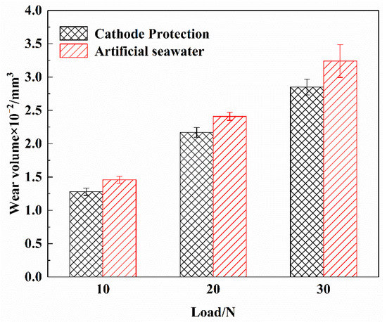 The volume losses of friction and wear of the TCN composite coating in artificial seawater with and without cathodic protection are shown in Figure 13. Under cathodic protection, the volume loss of the material increased with the load, and the wear amount enhanced from 1.28 × 10−2 to 2.85 × 10−2 mm3. In the corrosion state, the friction loss under the same load condition was further increased due to the synergism of corrosion and wear, and the wear amount of TCN enhanced from 1.46 × 10−2 to 3.24 × 10−2 mm3. Combined with Figure 12, it can be concluded that the passive film on the specimen’s surface produced microcracks under the fatigue effect of contact stress. In corrosive medium, active anions such as cl− were often adsorbed and gathered in the local area of the passive film, which destroyed the equilibrium state of dissolution-repair of the passive film, resulting in the dissolution rate of the passive film on the surface of the sample being higher than its repair rate, leading to the active dissolution of the passive film. The surface material became loose and easy to remove because of corrosion, and a passive film quickly formed on the exposed fresh surface [22]. In this way, the continuous cycle process of passivation–de-passivation further consumed the material on the sample surface, making TCN more easily worn under corrosion conditions under the same load.