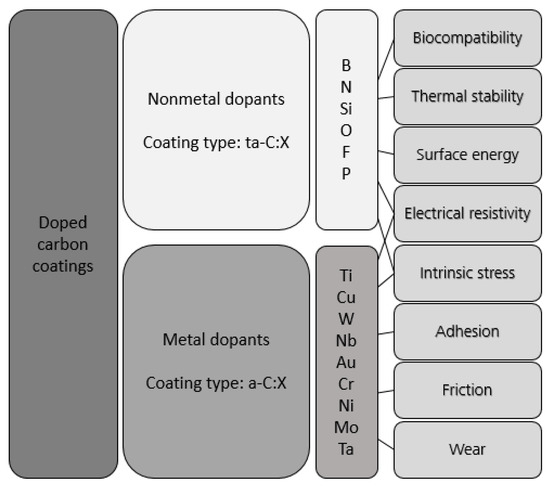 The doping of carbon coatings is a promising way to tailor coatings with regard to specific properties (see Figure 1). Several authors [2,10,11,12,13] investigate the effect of cathode modification and doping elements on the deposition and properties of carbon coatings, whereby the studies from Sánchez-López [11] and Zia [12] gave comprehensive overviews. The effect of doping carbon coatings is described in order to improve the properties of the coatings with respect to intrinsic stress, crack resistance or temperature stability (for references, see Table 1). In most cases, the coatings are doped by modifying the graphite cathodes with other elements. Doping carbon films can be realized in various ways. Cathode modification through the infiltration of graphite cathodes with saline solutions or liquid metal containing the modifying element [14] is one option. This requires an open porosity capable of infiltration in order to store the liquid. Another option is using a mixture of graphite powder and a modifying element containing powder, which is pressed and sintered [15]. The selective variation of the content of dopants in the coating during the deposition is possible via the co-evaporation of carbon and dopant-containing target(s). Finally, carbon evaporation can be carried out in a gas atmosphere (with hydrogen-containing [2], nitrogen-containing [16] and silicon-containing gas [17], etc.). Common physical vapor deposition (PVD) processes, such as arc PVD or sputtering, as well as combinations, such as plasma-enhanced chemical vapor deposition (PECVD) processes, can also be used as deposition processes [1].