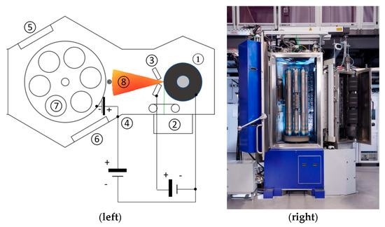 The experimental setup is shown in Figure 2. Evaporation was carried out in a high vacuum at a pressure of about 10−4 Pa. A pulsed vacuum arc discharge of the graphite cathode (Figure 2, (1)) produced the plasma (Figure 2, (8)), which mainly consists of positively charged carbon ions, electrons and, in the case of compound targets, also the positively charged ions of the doping element. Furthermore, neutrals and macroparticles were formed during the evaporation process. The repetitive ignition of the arc pulses was triggered by a pulsed laser using a commercial Q-switched, Nd-doped yttrium aluminum garnet (Nd-YAG) laser (Figure 2, (2)). The laser pulse length was about 100 ns, with an energy of about 15 mJ, which is smaller than the arc discharge energy by a factor of 1000 (approx. 15 J). The combination of the linear scanning of the laser spot and the rotation of the graphite target results in uniform erosion. The employed current source provides a sinusoidal current of up to 1600 A at a discharge duration of 330 μs. A pulsed bias voltage of 100 V was applied synchronously to the arc pulses. The duration of the bias pulse was set to 175 μs.