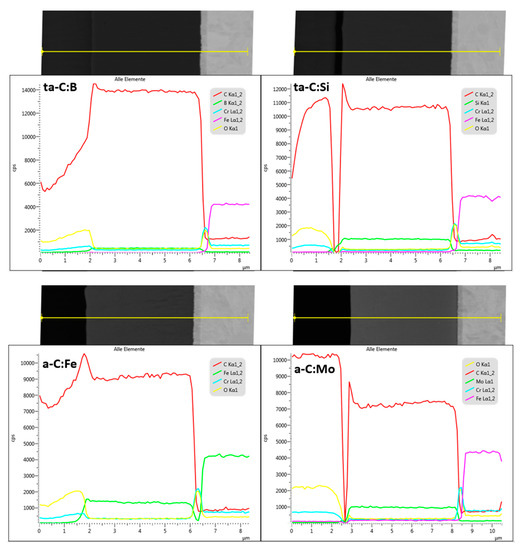 The elemental distribution within the doped coatings was analyzed by cross-section EDS analysis in SEM (Figure 4). Fe-containing coatings show a very slight increase in Fe from the interface to the surface of the coating, whereas the other coatings show no significant gradient over the coating thickness. Therefore, no evidence for macroscopic variations in composition or temporal effects on deposition can be detected. The significant drop in the measured signal for ta-C:Si and a-C:Mo is an artefact of the metallographic preparation. Here, a narrow gap has formed between the sample and the embedding medium, which led to the observed drop.