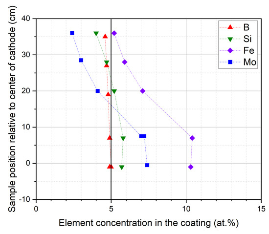 In the case of metals as doping elements, a more pronounced distribution in the chemical composition in relation to the sample position occurs, especially for Fe. On the sample along the plane at the cathode’s center, the Fe content reaches a maximum of around 10 at.%, which is twice as high as the nominal amount of Fe in the cathode. Chen et al. [15] find a similar behavior of Fe enrichment in coatings caused by several effects. A preferential evaporation of Fe, due to the differences in the melting temperature of Fe and C, could be an explanation. By increasing the distance to the plane of the cathode center, a continuous decrease in Fe content down to around 5 at.% is clearly visible. A similar behavior is obtained by doping with Mo. The sample position along the plane at the cathode center leads to a slightly higher amount of Mo compared with the nominal cathode composition, but towards the outer positions, a decrease in the amount of Mo is recognizable. The reduction in hardness and Young’s modulus in the metal-doped coatings (see Table 2 and [42]) is attributed to the effect on the formation of sp3-bonded C-bonds. Thus, it can be assumed that the relatively heavy metal atoms hinder the formation of three-dimensional sp3 structures and, thus, favor the formation of the (planar) sp2 structures.