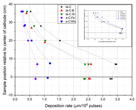 Finally, investigations were carried out on the deposition rate as a function of the vertical sample position. First, it should be clarified whether the deposition rate for the distribution of the doped coatings differs from pure ta-C. For comparison, the absolute and the normalized (to the highest value of each distribution) deposition rate is shown in Figure 6. In general, the deposition rate decreases towards the sample positions away from the plane of the cathode center. It should be mentioned that the plasma focus is slightly shifted upwards, also causing a shift in the deposition rate and the chemical content. Undoped ta-C has the highest absolute deposition rates for all the sample positions. B and Si doping leads to a significant reduction in the deposition rate by about 25%. However, a drastic reduction occurs in the case of Mo and Fe dopants: here, the deposition rate is reduced by about 65% (Mo) and about 80% (Fe) at the maximum.