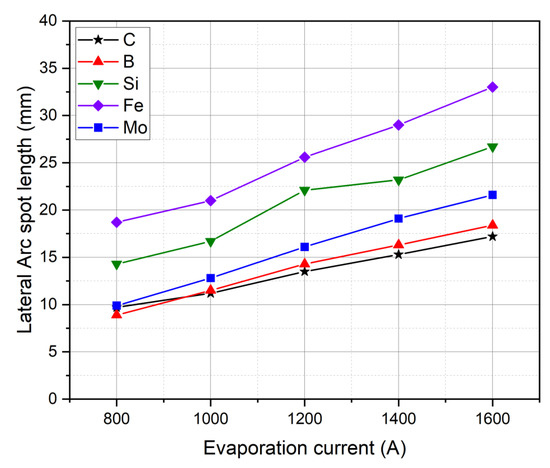 In order to understand the influence of doping elements on the deposition rates, investigations were carried out on the erosion of the cathodes during arc evaporation, as well as on the expansion of the arc spots on the cathode surface (Figure 7). For all cathodes, the lateral size of the traces of arc spots in relation to the evaporation current is shown in Figure 8. Generally, by increasing the arc evaporation current from 800 to 1600 A, the arc spots tend to spread in a more pronounced manner over the cathode surface, leading to an increase in the arc spot movement size. For B-modified and pure graphite cathodes, the arc spot movement is low, whereas the arc spots on Fe- and Si-modified graphite cathodes show a pronounced further spread of the arcs. The measurements may suggest that the expansion of the arc spots scales indirectly and proportionally to the cohesive energy of the cathode material. Values for the cohesive energy of the graphite and elements added to the graphite cathode are listed in Table 3. Additionally, an influence of the electrical conductivity or microstructure (e.g., porosity) of the cathode material on the movement of arc spot on the cathode surface was discussed for different types of graphite by Kandah et al. [6,8,9].