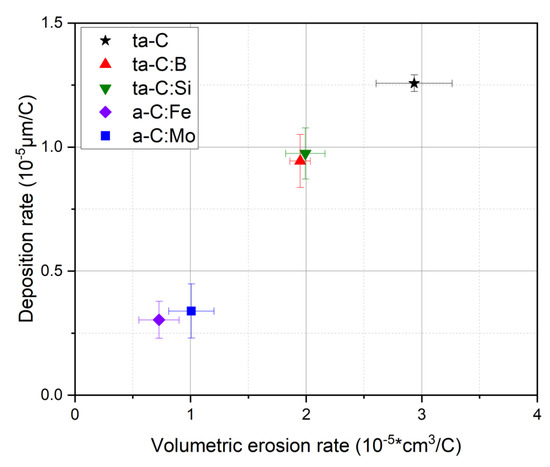 A higher erosion rate Er,v results in a higher deposition rate Dr. This almost linear relationship is illustrated in Figure 9. A pure carbon cathode with the highest erosion rate of around Er,v = 2.9 × 10−5 cm3/C exhibits also the highest deposition rate Dr = 1.3 µm/C compared to the modified cathodes. Corresponding to the reduction of the erosion rate, the deposition rate is also moderately reduced in the case of nonmetals (B, Si), and drastically so in the case of metals (Fe and Mo).