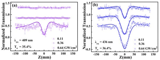 Here in Equation (1), α0 signifies the linear absorption coefficient, I the pulse laser intensity, and Is the saturable intensity. To suppress interference of the solvents in the nonlinear effect, we apply the Z-scan measurement to the solvents within the same parameters. The normalized transmission of the open aperture Z-scan is illustrated as below [38]: