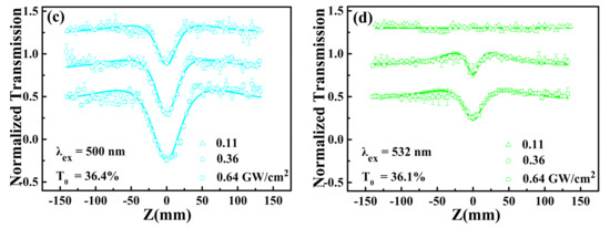 The absorbance spectra in Figure 3b show that the one-photon absorption effect only takes place when the wavelength amounts to no more than 400 nm. Thus, the physical process of RSA can be concluded as follows. When laser energy is low, nonlinear absorption cannot happen. However, with the laser energy increased, two photons will be absorbed by the electrons in the valence band and the latter will jump to the conduction band. To put it another way, two-photon absorption would occur and make the specimen display RSA [36].