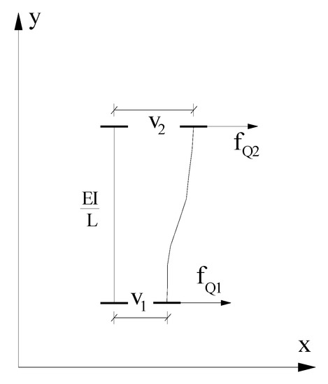 where denotes the elastic modulus, denotes the moment of inertia, is the shear element length, and is also called the storey stiffness. From Equations (24) and (25), the elementary stiffness matrix in local co-ordinates can be obtained as