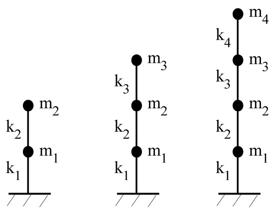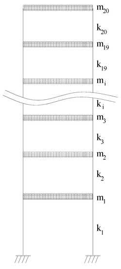 From Equations (30) and (31), it was found that and can be quickly obtained as long as , , , and are given. In especial, is independent of the material physical parameters and can be directly obtained by the DOF relation. For example, for the shear structures with two, three, and four storeys (shown in Figure 2) are listed in Table 1. This also means that the generalized shear energy can be directly calculated by Equation (18) or (19) even if structural FEM is not constructed in advance. Thus, damage localization using the proposed method for shear-type structures will be very simple and fast. This is the advantage of the proposed method over the previous modal strain energy methods.