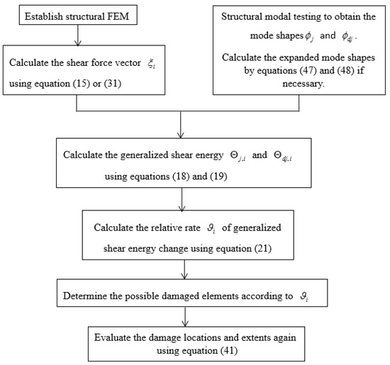In the end, a step-by-step summary of the whole technique is described as follows. Step 1: Establish the FEM of the shear-type structure. Step 2: Calculate the shear force vector using Equation (15) or (31). Step 3: Perform the modal testing of the structure to obtain the mode shapes and for the intact and damaged structures. Calculate the expanded mode shapes by Equations (47) and (48) if necessary. Step 4: Calculate the generalized shear strain energy and using Equations (18) and (19). Step 5: Calculate the relative rate of generalized shear energy change using Equation (21). Step 6: Determine the possible damaged elements according to the relatively large values in all the . Step 7: Evaluate the locations and extents of structural damages again using Equation (41). Accordingly, the flow chart of the whole technology is shown in Figure 3.