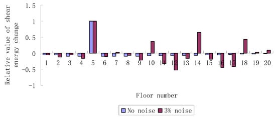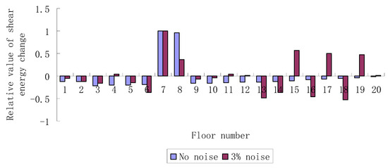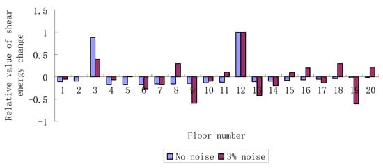 Damage case 3 is used to investigate the feasibility of the proposed method for identifying the damages of adjacent elements in the structure. Figure 7 presents the values of all obtained by the proposed method. It is clear from Figure 7 that the seventh and eighth floors can be determined as the damaged elements if noise free data is used. When noisy data is used, elements 7, 8, 15, 17, and 19 can be selected as the possible damaged elements since their corresponding rates of shear energy changes are relatively large. Using Equation (41), the damage parameters of these possible damaged elements can be calculated as , , , , and . Apparently, elements 7 and 8 can be finally determined to be the true damaged elements and the other elements can be excluded. The above results show that the proposed method can successfully identify the damages in the shear-type structure even if the contaminated data is used.