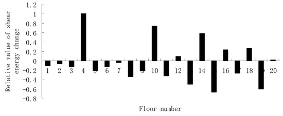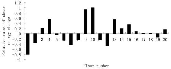 Next, damage case 4 is further used to demonstrate the proposed method by using the extended mode shape when only partial DOFs are measured. It is assumed that floors 2, 4, 6, 8, 10, 12, 14, 16, 18, and 20 are measured and the other floors are unmeasured. Using the corresponding partial DOF data, the extended mode shapes are firstly calculated by Equations (47) and (48) and then used for computing the generalized shear energy. Figure 9 presents the values of all obtained by the proposed method using the first-order extended mode shape. From Figure 9, elements 4, 9, 10, 13 and 15 can be determined as the possible damaged elements since their corresponding shear energy-change rates are relatively large. Subsequently, the damage parameters of these possible damaged elements can be further computed using Equation (41) as , , , , and . From the above results, elements 4 and 10 can be finally judged as the real damaged locations, while other elements are excluded. It has been shown that the proposed method is also applicable for the situation when the amplitudes in some of the stories are missed.