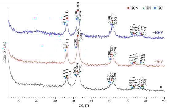 Figure 3 shows the X-ray phase analysis of the TiCN coatings deposited at various negative substrate bias voltage. The diffractogram shows that three main phases are detected in all coatings: TiCN, TiN, and TiC. The structure of TiCN coatings changes from amorphous to crystalline, as can be seen from the picture. The samples obtained with substrate bias show narrower peaks presenting TiCN, TiN, and TiC compared to the without voltage coating, indicating good crystallinity. Table 2 shows percentage data on the phase composition of the coatings obtained at 0, −70 and −100 V. The main phase forming coatings during magnetron sputtering is titanium carbonitride. Its maximum content is found in the coating formed at a potential voltage of −70 V (58.2%).