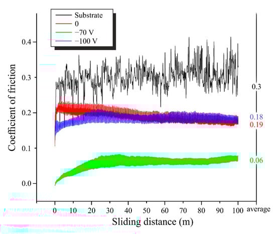 The wear resistance of TiCN coatings depends mainly on the microstructure, hardness, and adhesion, which are usually measured in terms of friction coefficient and wear mass loss [25]. The coefficient of friction (CoF) of all coatings was measured relative to Si3N4 balls. TiCN coatings generally have a low friction coefficient value. The graph of friction coefficient with an average value of deposited coatings at Us = 0, −70, −100 V, and titanium substrate VT6 is shown in Figure 4. The resulting coatings showed an average CoF value from 0.06 to 0.19. It can be seen that the sample deposited on the substrate bias of −70 V has a low CoF. In other cases, the CoF values are approximately the same, which are in the area of about 0.18. The CoF results are in good agreement with those obtained for TiCN films by Saoula N et al. [9,25]; however, the CoF for the −70 V sample is much lower than in these works. The composition of the transition layer and the friction interface should be considered concerning the change in CoF [26]. The low CoF behavior is explained by the formation of third bodies in the contact and the subsequent formation of a lubricating transition layer, which is mainly due to the increased carbon sp2 [27,28]. In addition, the elemental and phase analysis of this coating proves the increased carbon composition. In addition, a possible reason for the decrease in the CoF at −70 V may be an increase in hardness. According to [29,30], a decrease in the friction coefficient correlates with surface hardening.