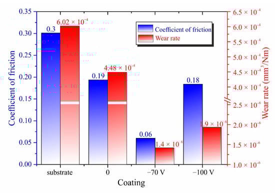 Tribological tests showed reduced wear in TiCN coatings obtained with substrate bias compared to without voltage coatings. Figure 5 shows the average CoF and wear rate (WR) for the VT6 substrate and TiCN coatings obtained at Us = 0, −70, and −100 V. The TiCN coatings deposited without voltage and at −100 V showed more similar CoF, but the WR differ significantly for them. The WR of the −100 V sample is almost two times lower than the WR of the sample without voltage. The best results among the obtained coatings were achieved by the coating deposited at −70 V with WR equal to 1.4 × 10−6 mm3/mN. This is due to the higher hardness, higher sp2 carbon content, and higher proportion of phase composition TiCN, which is consistent with the results of works [9,25]. The coatings wore approximately close to each other despite the significant difference in the average CoF values for −70 and −100 V. The −70 V sample showed a strong decrease in CoF, which was certainly due to the higher carbon content in its structure (34.4 at %), which promotes the growth of amorphous intergrain phases [17]. All obtained coatings show low CoF without sharp jumps in the graph, which indicates a high cohesive and adhesive strength of the formed coatings by the MS method [31].