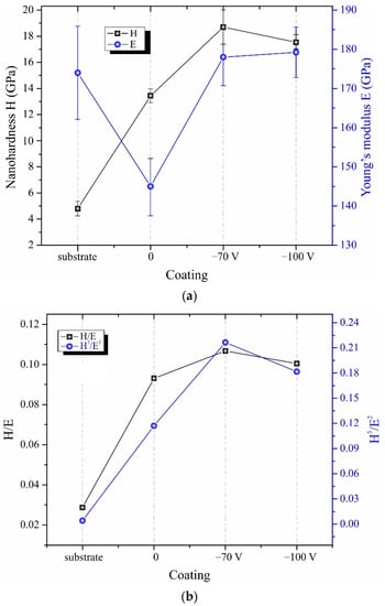 Nanohardness of VT6 substrate and TiCN coatings obtained at Us = 0, −70, and −100 V: (a) nanohardness and Young’s modulus; (b) H/E and H3/E2 values for substrate and obtaining coatings.