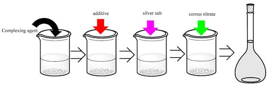 The silver brush-plating solution was made by adding the above drugs listed in Table 1 into a beaker and stirring at room temperature with a homogenizer for at least 20 min. Afterward, the pH of the solution was adjusted to weakly alkaline (pH = 8–9) by ammonium hydroxide and nitric acid. The preparation process was shown in Figure 1.