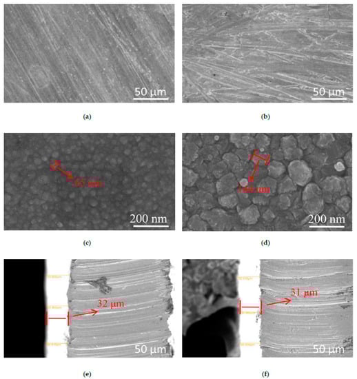 This phenomenon indicated that the addition of cerium nitrate could make the grain size more uniform and finer, reduce the porosity of the coating and the crack density of the silver layer, and make the grains more orderly. The same phenomenon was found by Zhang et al., who added rare-earth elements (Sc2O3, Y2O3, and La2O3) to aluminum matrix composite coatings []. From the images of the cross-section of the coating, the silver coating and the copper substrate all had an obvious, homogenous, and tight interface with or without cerium nitrate, and the thicknesses of the coating were all over 30 μm, which could meet the needs of the power industry.