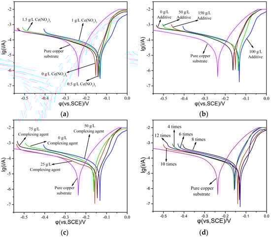 Plating electrochemical workstation Tafel polarization curve: (a) different amounts of cerium nitrate content; (b) different amounts of additive content; (c) different amounts of complexing agent content; (d) different brush-plating times.