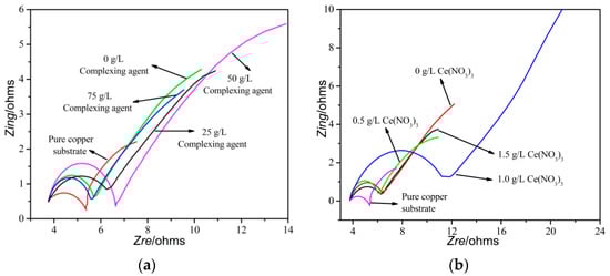 It can be seen from the impedance map that the slope of the low-frequency region of all curves is about 1, which indicates that the roughness of the silver coating in this experiment was not large or flat. It can be seen from the high-frequency region of the curve that the high-frequency capacitive arc resistance of the silver coating layer first increased and then decreased with the addition of a complexing agent or cerium nitrate, which indicated that the shielding ability of the coating first increased and then decreased. Additionally, the highest of the high-frequency capacitive arc resistance could be obtained with the dosage of a complexing agent or cerium nitrate were 50 g/L and 1.0 g/L, which corresponded to the corrosion voltage of the coating layer.