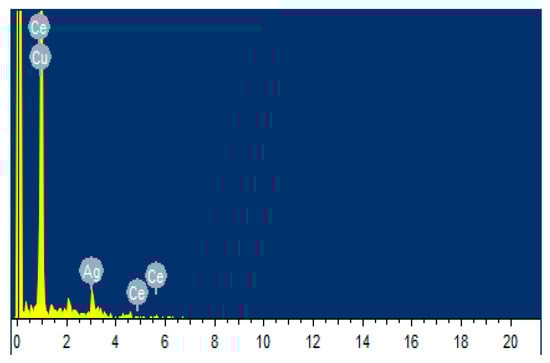 As shown in Figure 7 and Figure 8 and Table 3, the elemental composition and distribution of the coating were analyzed by a combination of EDS and element mapping. As can be seen from Figure 7 and Table 3, the surface of the coating contained Ag, Ce, C, Cu, and Au species elements, wherein the silver was the most abundant, reached 70.78% (weight), where the C probably attributed to the organic component that was added to the coating solution, the gold was due to the gold-spraying process before the test, and Cu was the matrix material. This indicated that the coating layer was based on silver.