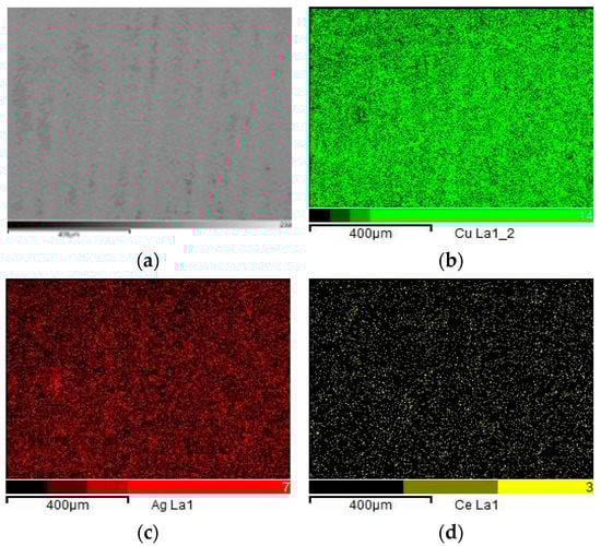 As evident from Figure 8, in which the elemental composition of the coating can be clearly seen, the silver element was uniformly coated on the surface of the copper layer substrate, and the small amount of cerium element was homogeneously dispersed in the silver coating layer, which indicated that the coating solution has great brush-plating property, stability, and homogeneity.