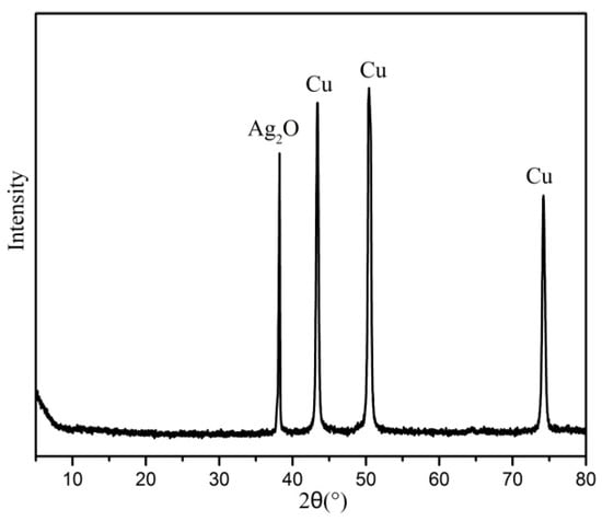 In order to further verify the silver crystal, the XRD results of the silver coating layer are shown in Figure 9. It was found that four intense diffraction peaks appeared at (2θ)—38.07°, 43.33°, 50.37°and 74.15°, respectively. The peak (2θ = 38.07°) was attributed to the 200 plane of silver oxide [], while the peaks (2θ = 43.33°, 50.37°, and 74.15°) corresponded to the copper’s 111 plane, 200 plane, and 220 plane, respectively []. The result suggested that the silver coating layer was the main silver oxide.