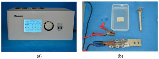 Copper (Cu) has been widely used in the electric power industry due to its high electrical and thermal conductivities, adequate strength, and low cost [,,]. However, equipment made by copper is easily oxidized in the natural environment, and the copper oxide film is not as dense as an aluminum oxide film, to form a protective effect on itself. Furthermore, the oxide film of copper directly affects its own electrochemical performance, such as electrical and thermal conductivity. Due to the high resistance of the oxide film, considerable amounts of power loss and heat are generated at the isolating switch and other joint equipment, which further oxidize the copper equipment, thus causing power breakdowns. According to statistics, about 20% of power equipment failures are caused by overheating of the contact such as the guide joint and terminal post of the equipment, and almost 80% of power failures are caused by overheating of the contact during the peak period of power consumption. In order to avoid this, some strategies were applied to protect power equipment joints from corrosion or damage, such as electric brush-plating and electrochemical deposition methods [,,]. The electric brush-plating technique, in which equipment surfaces are coated with a coating layer by a coating solution, was widely applied in the surface protecting and machine-building industries []. Due to its advantages of low cost, easy movability, high deposition rate, and simple device, it was widely used in repairing isolating switches and other joint equipment.