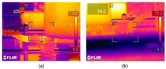 In order to analyze the repairing effect of the silver coating solution on the transformer’s isolating switch, an infrared thermometer was applied to measure the temperature of the isolating switch treated with or without the silver coating solution. The results are shown in Figure 12. When the transformer ran at full load, the isolating switch without the silver coating had a high temperature of 100 °C during full load operation; however, a low temperature of 54 °C was obtained when the isolating switch was repaired with the silver coating solution. This result suggested that the coating solution system can effectively repair the transformer, reduce the contact resistance of the parts, and effectively solve the abnormal heating phenomenon during the normal operation of the equipment. Through the application example of the silver-plating process in the transformer, it was proved that the coating system is very applicable to power equipment, especially for large equipment outdoors.
