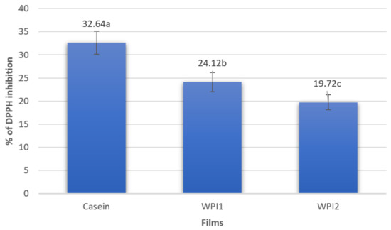 Antioxidant capacity of milk protein-based edible films reported as % of 1,1-diphenyl-2-picrylhydrazyl (DPPH) inhibition. Different letter indicates significant differences (p < 0.05) between films.
