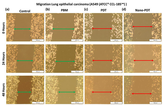 The scratch assay is an in vitro technique that has been extensively used in science to determine the contribution of molecular and cellular mechanisms to cell migration over the years [30]. The scratch test is conducted by creating a “scratch” in a monolayer of cells and photographing the cells at the start and at regular intervals throughout cell migration as the scratch closes. Figure 3 shows the migration of lung epithelial carcinoma cells (A549) at 0, 24, and 48 h post-PDT treatment. Untreated (a) control cells show slight motility towards the central scratch and (b) cells receiving PBM show signs of rapid migration where the cells move towards the central scratch and the cell density increases. Comparatively, cells treated with (c) PDT and (d) nanoPDT show a decreased migration rate and were not able to close the scratch over time, where dead cells and cell debris were seen floating in the culture medium due to cell arrest.