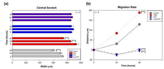 The analysis of migration morphology shows (Figure 4a) the measured scratch width over a period of 48 h, whereas the control shows a significant closure after 48 h, and PBM treatment groups indicate significant closure 24 and 48 h post-treatment of the central scratch over time, indicating enhanced migration because of PBM [21]. Cells treated with PDT and nanoPDT indicate no closure of the central scratch over time due to cell death. Similarly, the migration rate of the cells (Figure 4b) measured over time indicate that there was a significant increase in migration for cells treated with PBM alone, indicating the proliferative and motility effects of PBM induced on cells [21], whereas PDT- and nanoPDT-treated cells both showed significant decreases in the distance the cells can travel. It is seen that lung cancer cells treated with PDT and nanoPDT were unable to close the central scratch, negating the proliferative effects and decreasing cellular migration due to cell death induction caused by PDT.