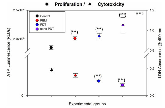 Cell proliferation was measured using ATP luminescence in relative light units and cytotoxicity was measured as the amount of LDH leakage caused by membrane damage and cell death, where it was read using an absorbance of 490 nm. Proliferation results (Figure 5) show that control cells and PBM-treated cells had an increased proliferation rate, with PBM cells having a significant increase in proliferation. Cells treated with PDT and nanoPDT had a significant decrease in proliferation compared to the control and cells treated with PBM alone. There was a slight decrease seen in cells treated with nanoPDT compared to PDT, however this decrease was not significant. Cytotoxicity results show that control cells and PBM-treated samples released little LDH into the environment, and that cells treated with PDT and nanoPDT both released significant amounts of LDH. Additionally, nanoPDT-treated samples showed a higher increase in LDH release when compared to PDT-treated samples.