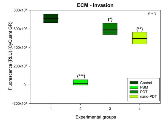 The ability of lung cancer to spread metastatically was determined by ECM invasion, where a rise in fluorescence indicates invasion and a decrease indicates reduced invasiveness. Figure 7 shows the cellular fluorescence and Table 2 shows the percentage of cells relative to the initial cell seeding amount that have passed through the ECM. The control sample shows the spontaneous migration of lung cancer cells indicating the metastatic nature of lung cancer with a mean fluorescent measurement of 714,685 RLUs, where 9.9% of the cells initially seeded passed through the ECM. When comparing the treated samples to the control, it is seen that cells treated with PBM (17917 RLUs) have a significant decrease in their invasion abilities, more so than the PDT-treated samples, where only 0.2% of cells passed through the ECM. This phenomenon is ascribed to the increase in proliferation that is seen during lung cancer cell PBM treatment, where the cells tend to rather proliferate than invade during the process [31]. Lung cancer cells treated with PDT (588916 RLUs) and nanoPDT (498938 RLUs) show a significantly decreased ability to invade the ECM post-treatment compared to the untreated control, indicated by a decrease in the fluorescence of the RLUs measured, where 8% and 6.9% of PDT- and nanoPDT-treated cells passed through the ECM, respectively. The decrease in cell invasion was more significant for nanoPDT-treated samples. This indicates that PDT and nanoPDT more so has a debilitating effect on the invasive and metastatic properties of lung cancer cells.