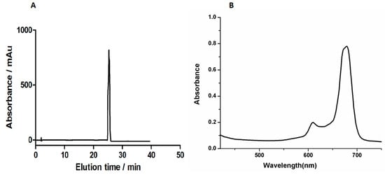 The compound (CPZ−GGG(RW)3) was designed and synthesized according to our previously reported method and then further conjugated with the antimicrobial peptide (GGG(RW)3) for photodynamic application against the microorganisms. The conjugate was characterized by electrospray ionization mass spectrometry (ESI-MS) and fourier transform infrared (FTIR) spectroscopy. The ESI-MS result was found to be m/z (M + H)+ = 1820. The UV/Vis absorption spectrum of the CPZ−GGG(RW)3 conjugate was recorded to range from 550 to 800 nm in DMSO and found to have a 680 nm absorption intensity (Figure 1). The HPLC chromatogram appeared at 26.5 min on the C−18 reversed-phase HPLC system (Figure 2A).