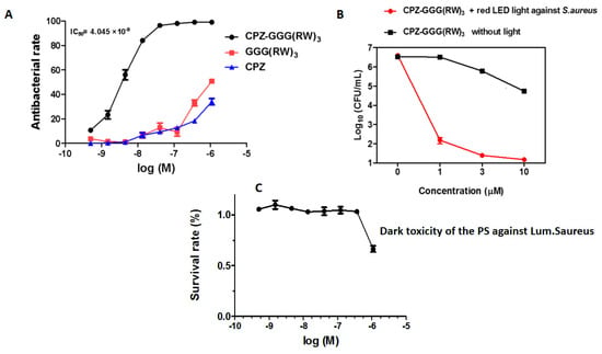 Phototoxicity of CPZ-GGG(RW)3 and antibacterial efficacy of GGG(RW)3 against the luminescent S. aureus (A) under light illumination using red LED light illumination (22.5 J/cm2). Photodynamic effects of CPZ-GGG(RW)3 against S. aureus (B) were also measured using the colony counting method under light illumination from a red LED light (22.5 J/cm2), as well as the dark toxicity of CPZ-GGG(RW)3 against the luminescent S. aureus under the same experimental condition (C).