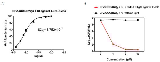 To further assess the photoinactivation effect (PDI) of the PS against the Gram-negative E. coli strain of bacteria, we first evaluated the effect of high concentrations of CPZ-GGG(RW)3 (10, 30 and 50 µm) against the E. coli strain up to high concentrations under red LED light illumination at a light dose of 22.5 J/cm2 using the bioluminescent strain and CFU assay measurements. We observed that no photodynamic effect was achieved against Gram-negative E. coli under this condition. Additionally, we further added KI salt (100 mm) in combination with the PS (1.0, 3.0 and 10 µm), followed by red LED light illumination for 5 min with a light dose of 22.5 J/cm2. Interestingly, we found that the synergistic effect of KI and the PS led to a significant killing of the E. coli strain, with a 5-log reduction in CFU units, and 875 nm IC50 was obtained against the bioluminescent strain, demonstrating that the toxicity of KI was enhanced with an increase in PS concentration (Figure 5A,B).