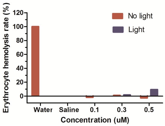 The photodynamic effect of the PS and the positive charges of a molecule may cause toxicity toward human erythrocytes. We used the hemolytic assay to evaluate the toxicity of the PS toward mammalian cells. In our experiment, we treated human red blood cells (RBCs) with different concentrations (0.1, 0.3 and 0.5 µm) of PSs, which were higher than the IC50 value obtained in our PACT experiment. We found that ZnPC-GGG(RW)3 showed 10% and 2% photohemolysis at higher concentrations (0.5 and 0.3 µm) compared with water hemolysis used as a positive control. The dark hemolysis of the PS showed no obvious lytic effect on human erythrocytes (Figure 6).